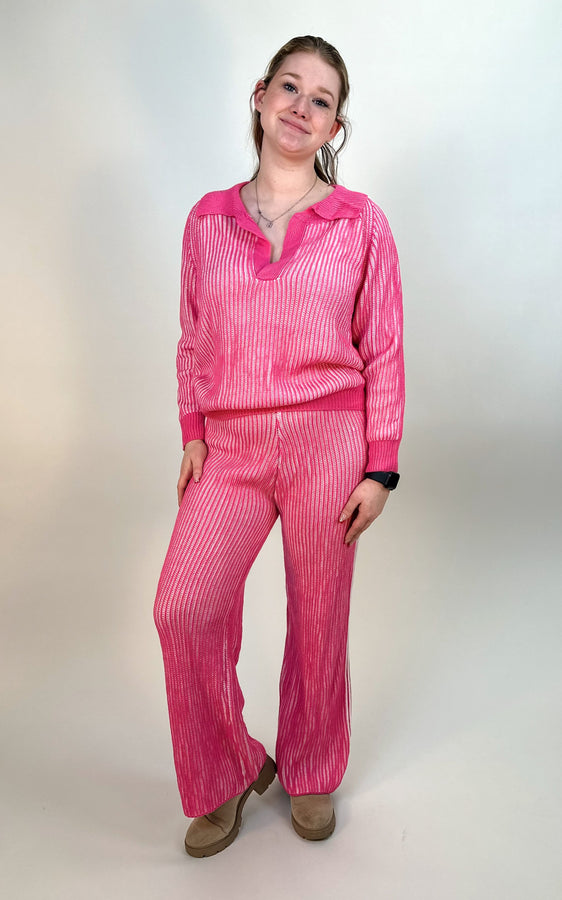 BiBi Two Toned Textured Ribbed Knit Sweater and Pants Set in Pink/Ivory