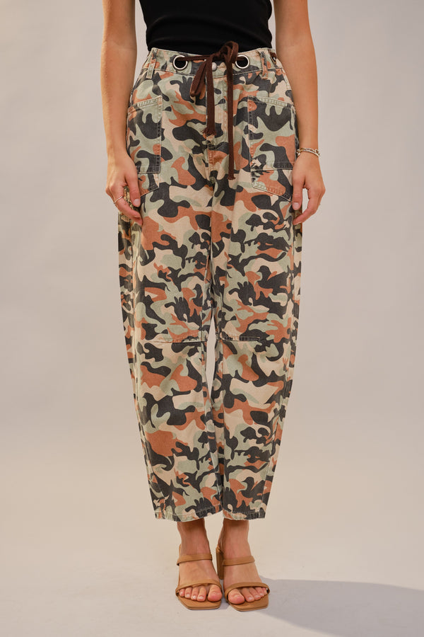 • Blue B Camo Print Barrel Leg Pants with Grommet Waistband in Camo Mix