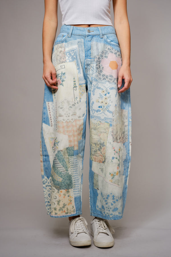 • Blue B Patch Print Barrel Leg Jeans in Light Denim