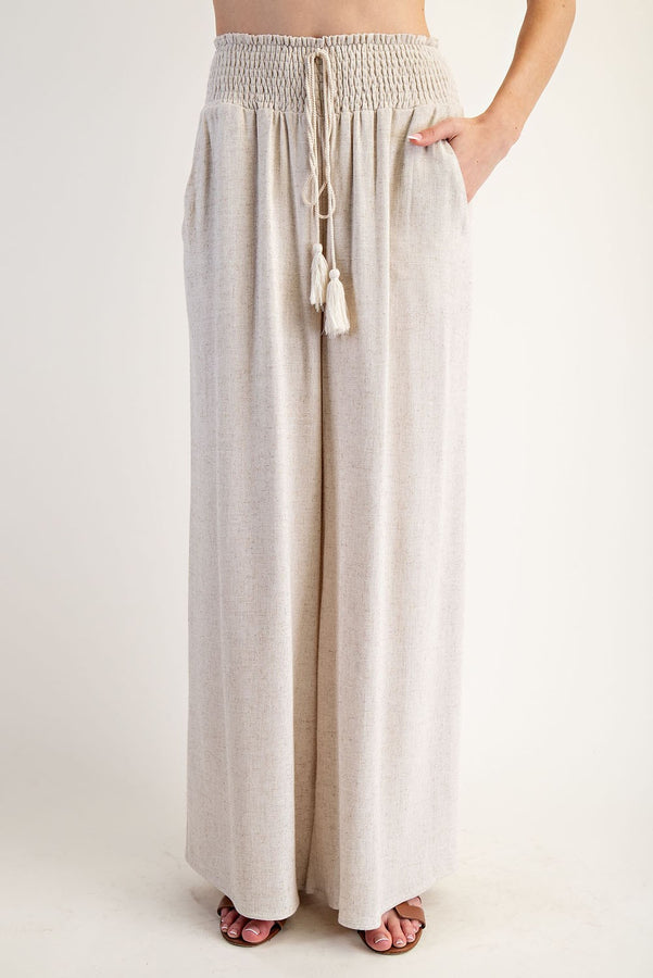 • ee:some Striped Print Pants with Open Side Hem with Contrasting Color Ribbon Ties in Coco