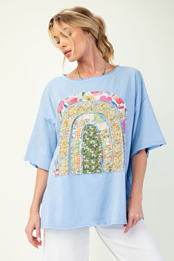 • Easel Mineral Washed Lace Flower Patch Top in Teal