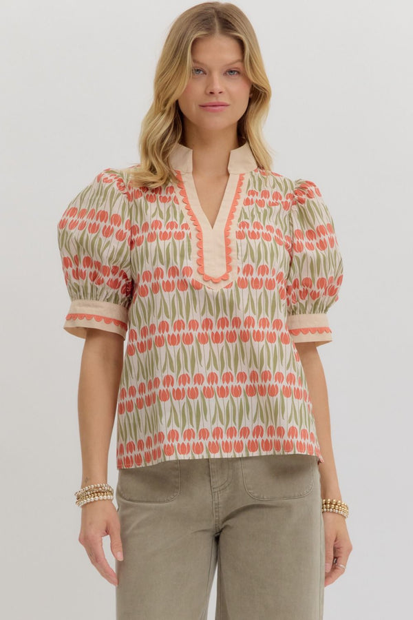 Entro Floral Pattern Top with Scallop Trim Embellishment in Ecru