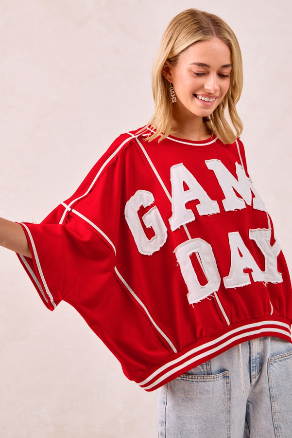 BiBi OVERSIZED French Terry Top with GAME DAY Letter Patchwork Front in Red/White