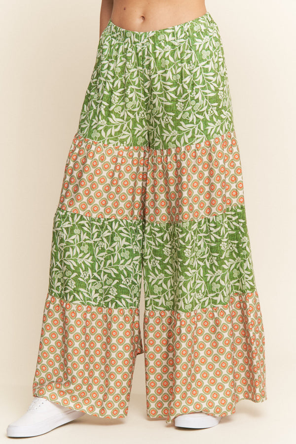 J.nna Color Block Mixed Print Tiered Pants in Green Multi