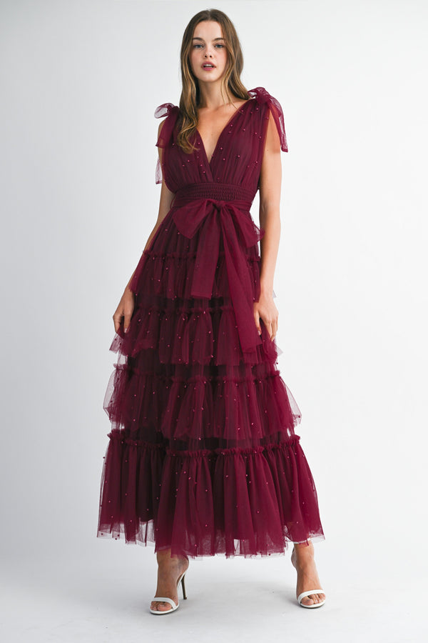 MABLE Pearl Stud and Mesh Tulle Tiered Maxi Dress in Burgundy