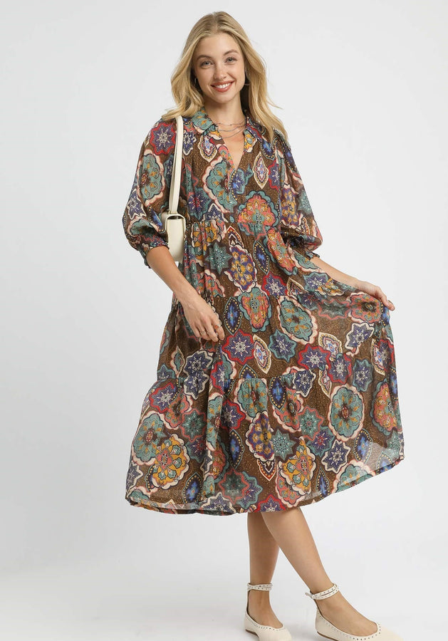 Umgee Lightweight Bold Floral Print Midi Dress in Brown Mix