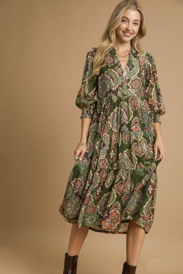 Skies are Blue Mixed Print Button Front Midi Dress in Cream-Olive