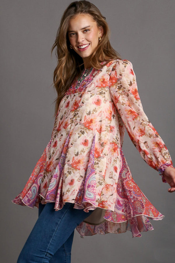 Umgee Mixed Print Long Sleeve Ruffle High Low Hem Top in Rose