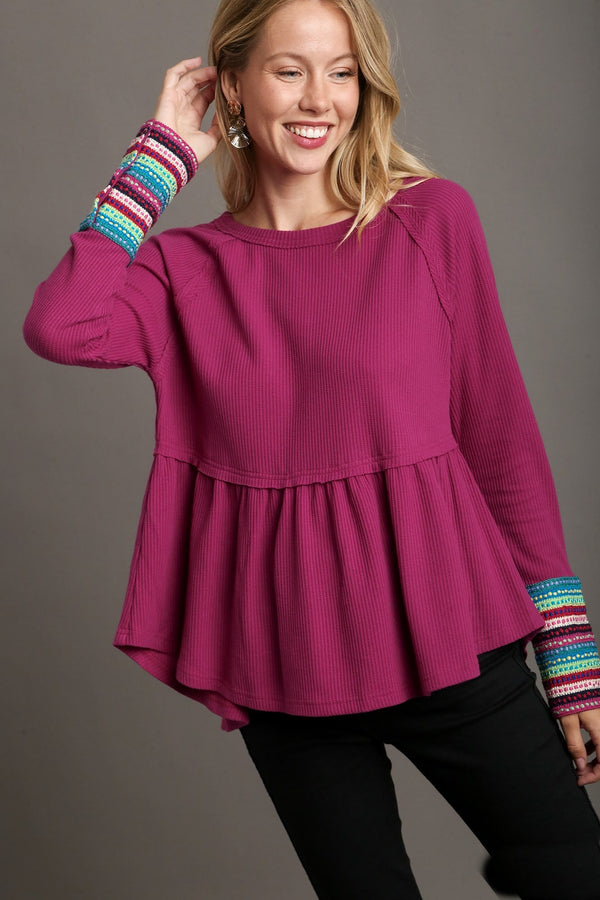 Umgee Baby Doll Waffle Knit & Multi Color Trim On Sleeve in Magenta