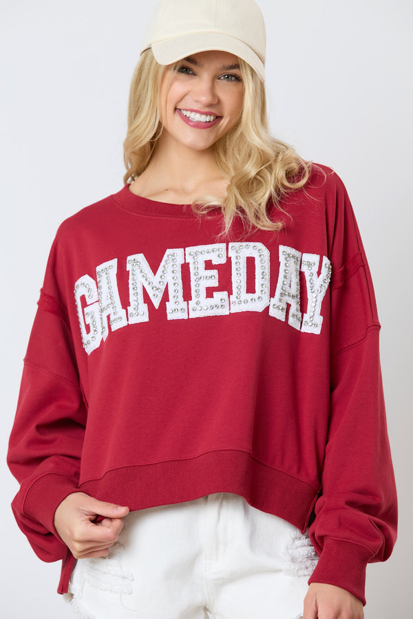 Peach Love Terry Knit Sweatshirt with Towel Knit GAME DAY Patches with Rhinestones in Crimson