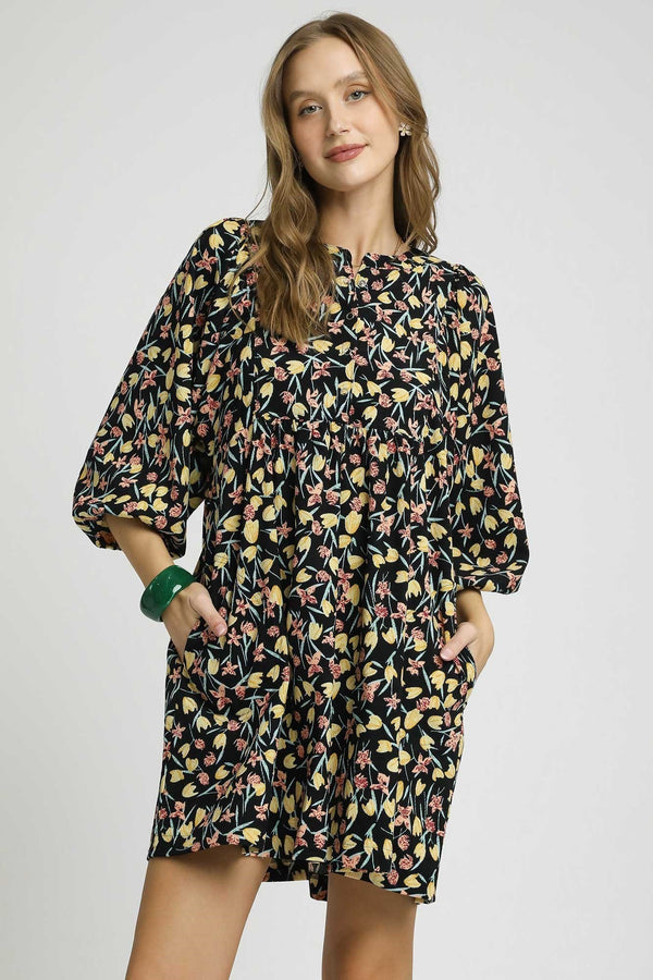 Umgee Corduroy Floral Print Baby Doll Mini Dress in Black