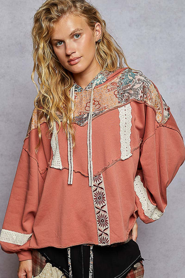 POL French Terry and Print Patch Hooded Top in Ginger Spice