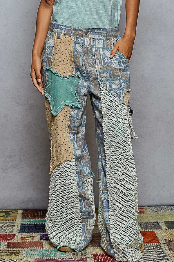 POL Denim Studded and Crochet Patch Pants in Sand Leopard