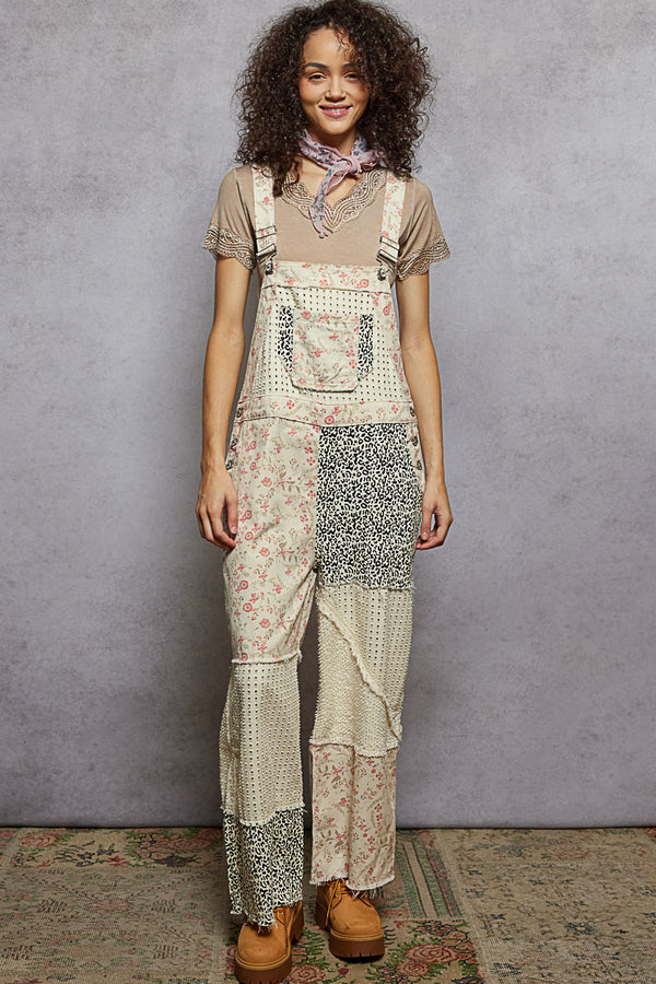 POL Mixed Print Patchwork Twill Overalls in Cream