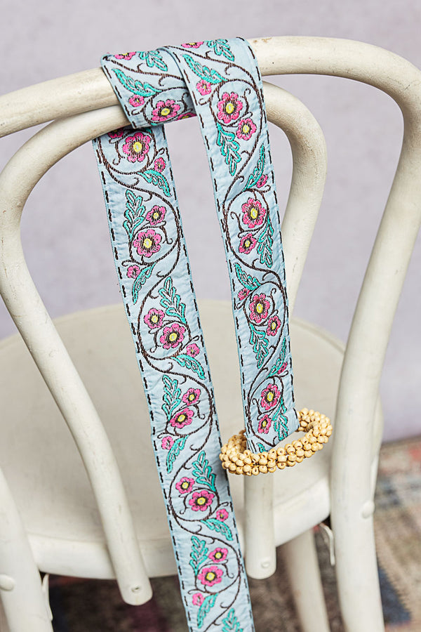 POL Multi Color Floral Embroidered Belt with Ticking Trim in Sky Blue
