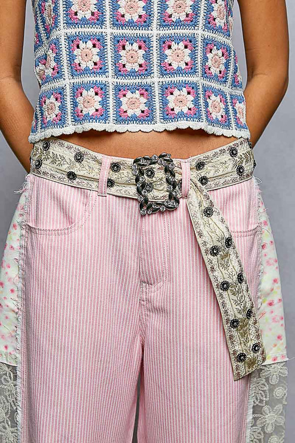 POL Floral Embroidered Belt with Lace Trim in Pistachio