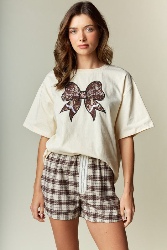 RARERAW OVERSIZED T-Shirt with Lace Football Bow Applique on Front in Vintage Ivory