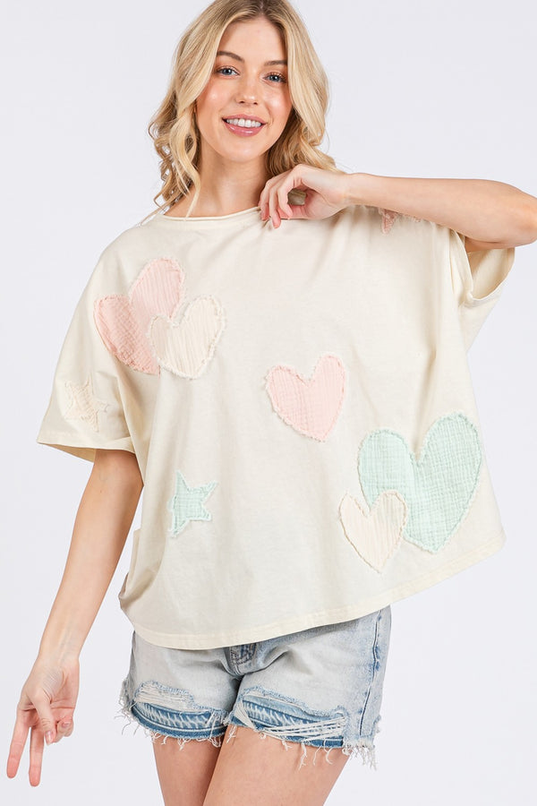 Sage+Fig OVERSIZED Top with Multi Colored Heart and Star Patches in Cream
