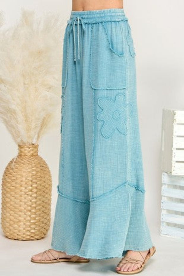 Sage+Fig Boho Gauze Pants with Flower Patches in Denim Blue