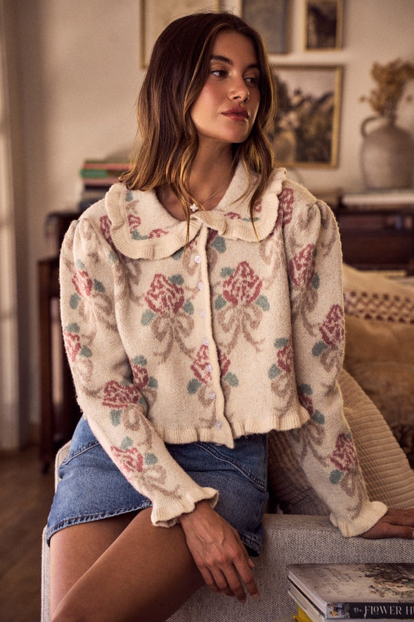 So Me Floral Pattern Sweater Knit Cardigan in Cream