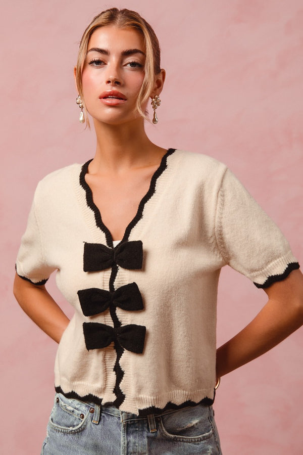 So Me Knit Sweater with Contrasting Color Bows and Scalloped Edges in Cream/Black