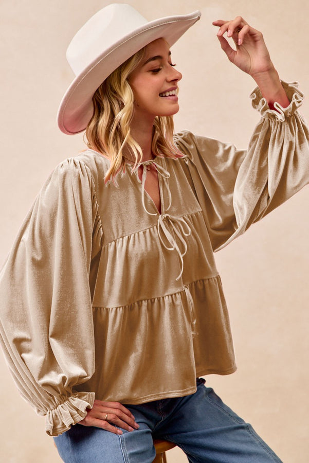 BiBi Velvet Bow Tie Tiered Top in Champagne