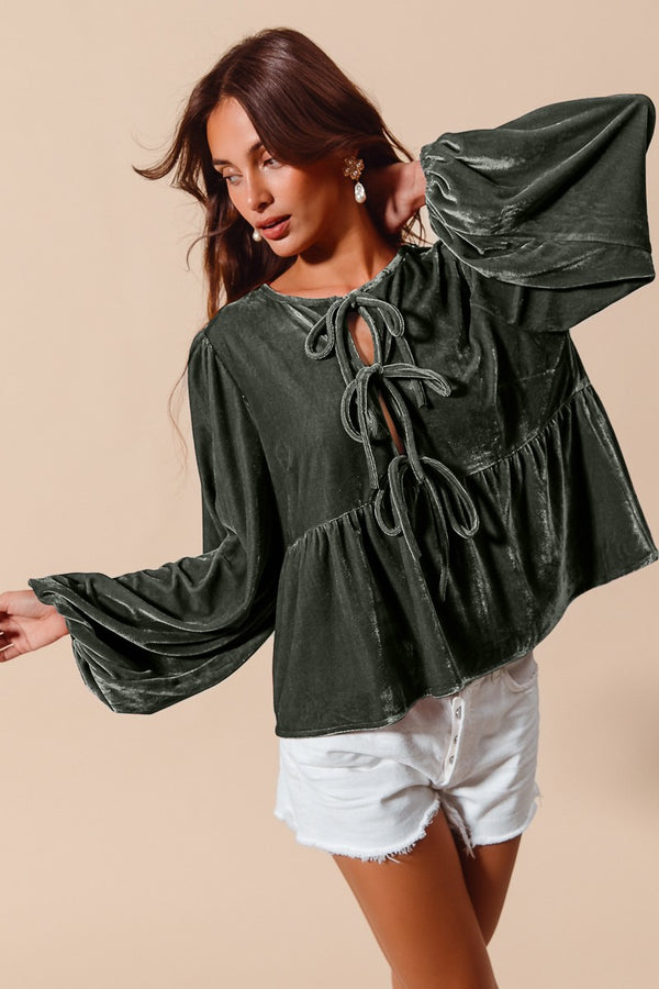 Umgee Solid Color Velvet Top with Lace Polka Dot Sleeves in Olive