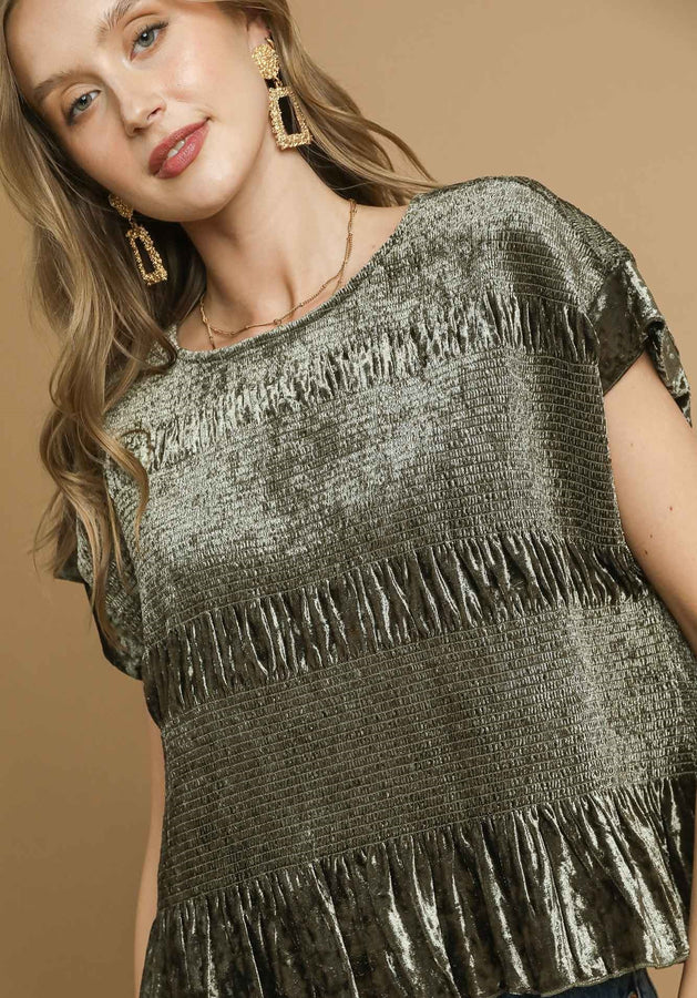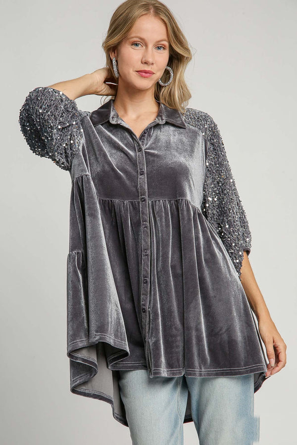 Umgee Velvet Tunic Top with Sequin Contrast in Gunmetal