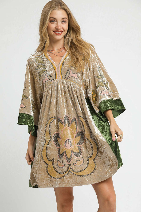 Umgee Velvet Mini Dress with Floral Embroidery in Green