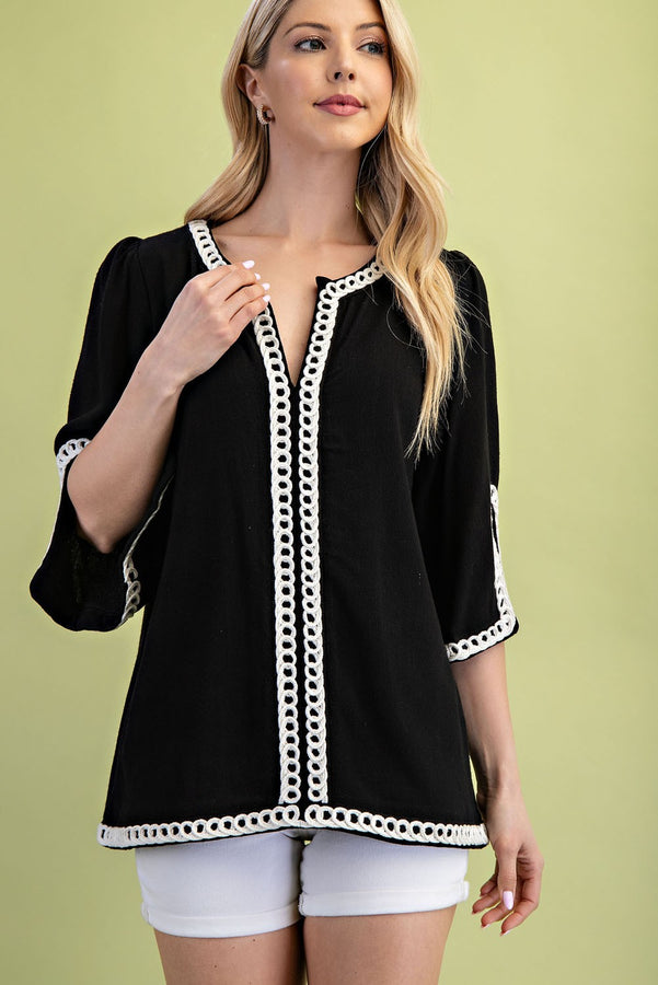 GiGio Solid Color Linen Blend Top with Trim Details in Black