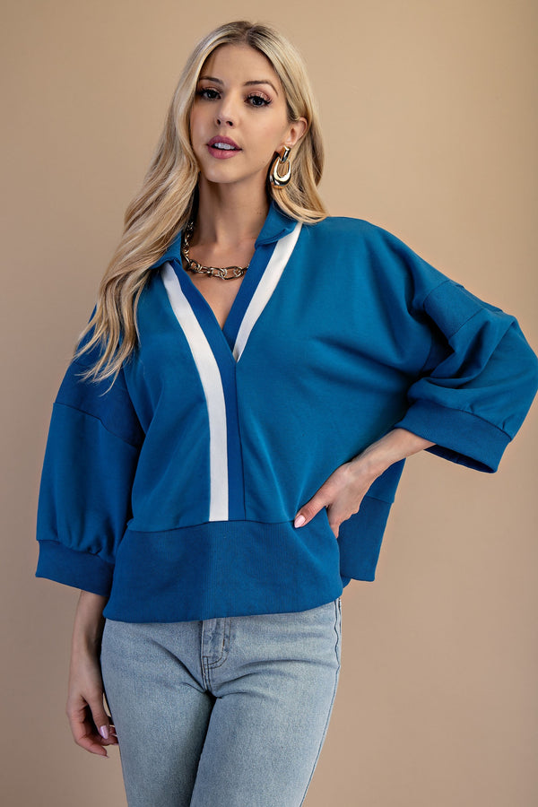 GiGio OVERSIZED Terry Knit Top with Contrasting Stripe in Steel Blue
