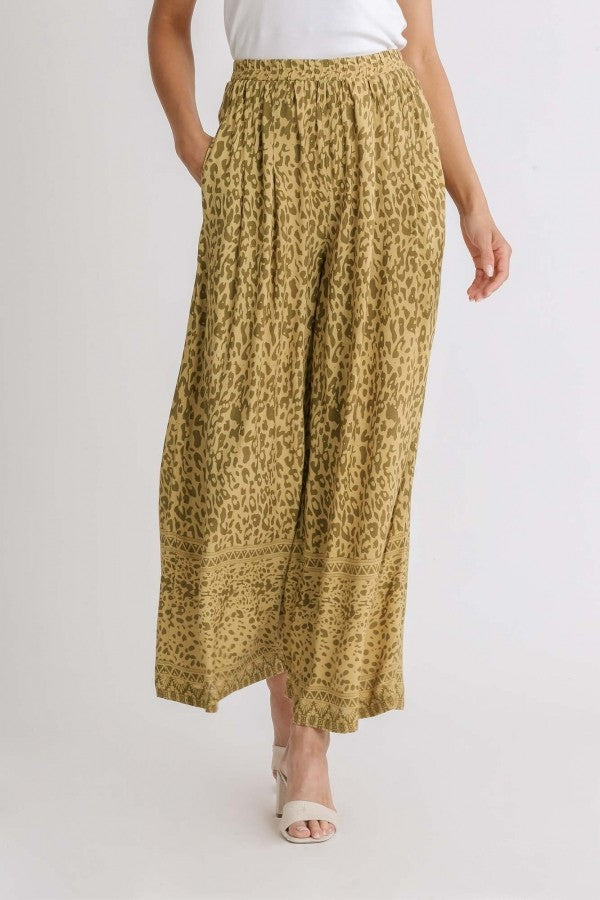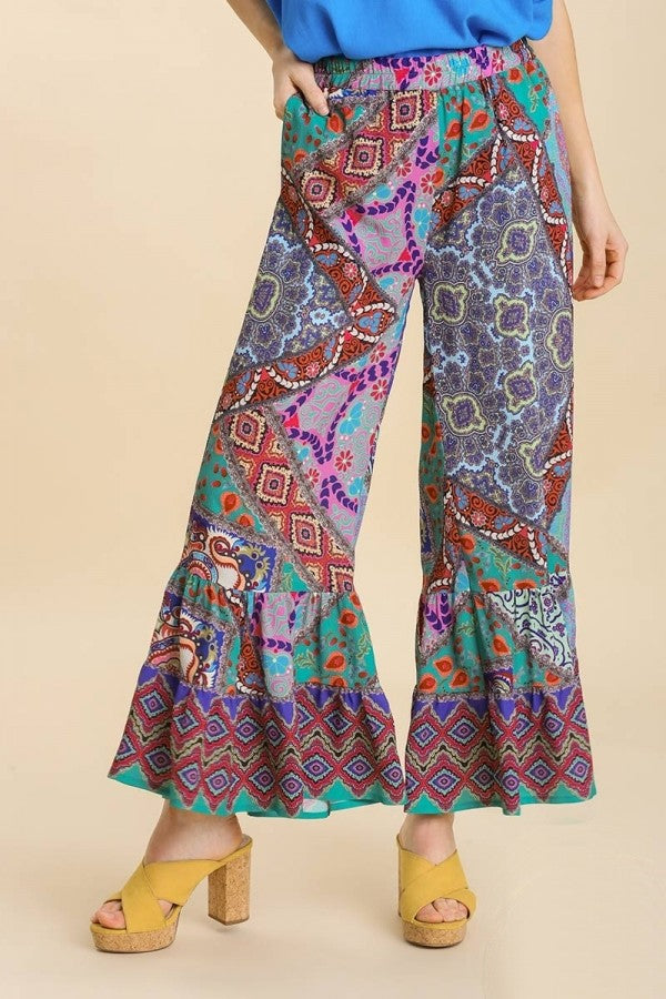 • Umgee Wide Fit Mixed Print Bottoms with Elastic Waistband & Side Pockets in Teal Mix