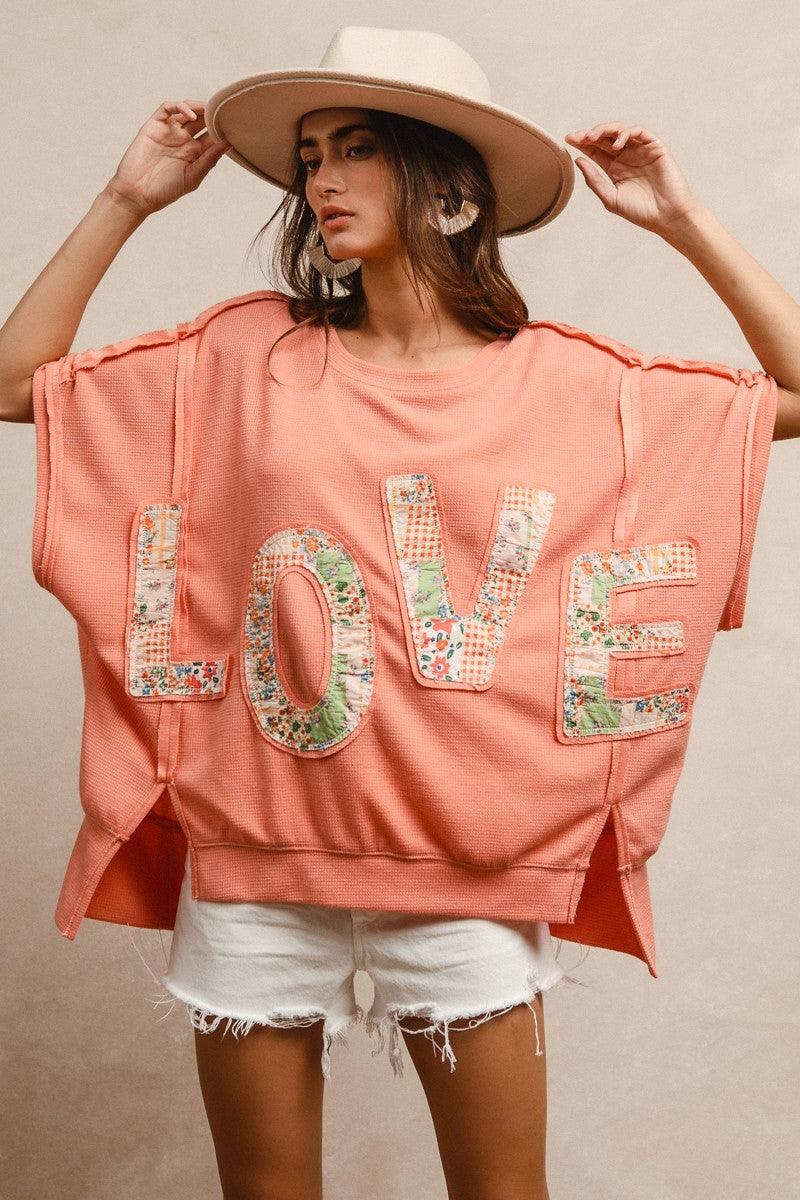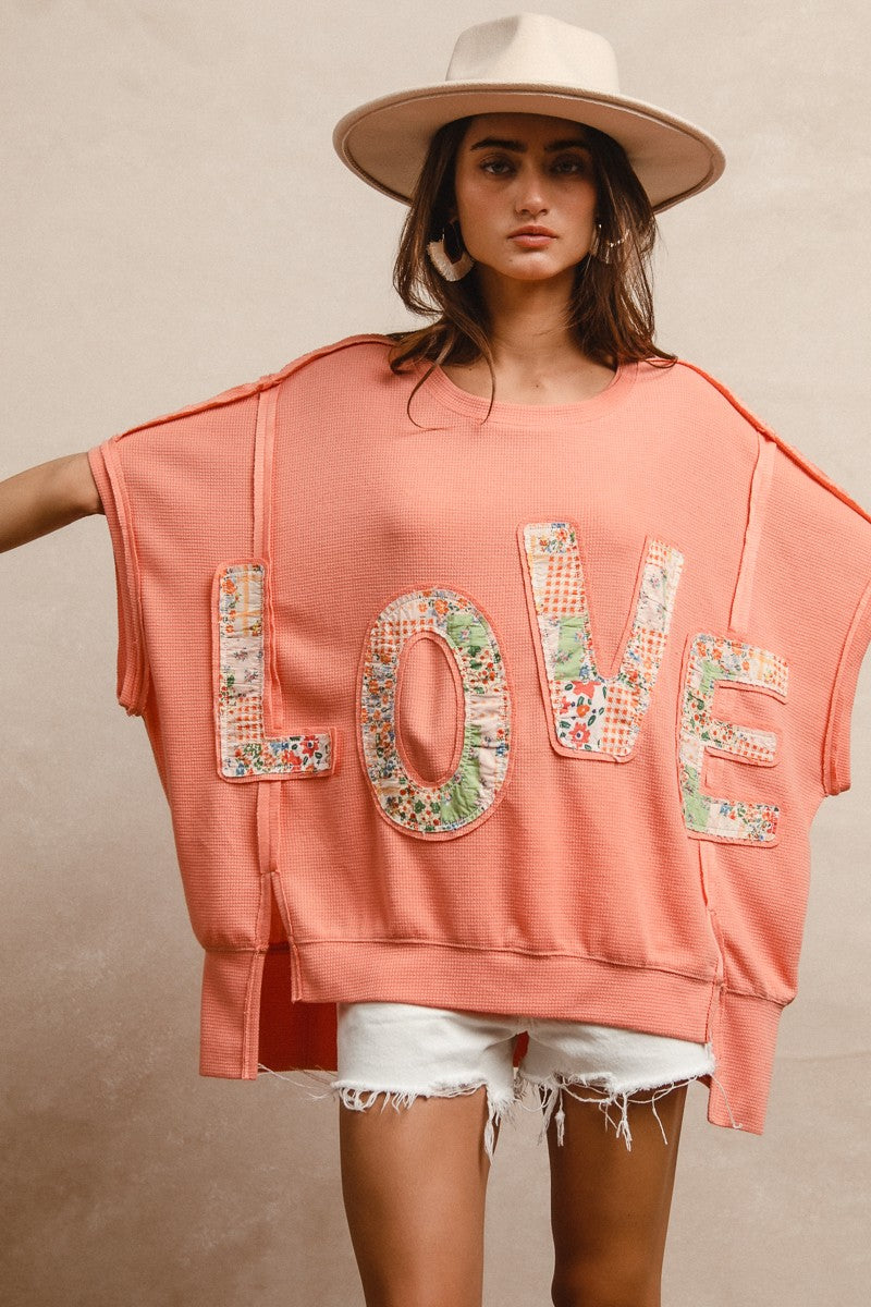 BiBi OVERSIZED Textured Top with Floral LOVE Letter Patched Front in Apricot