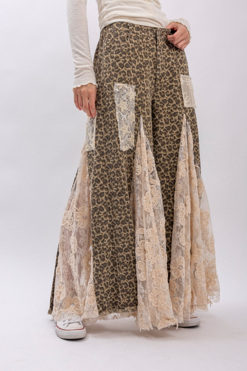 BlueVelvet Leopard Denim with Floral Lace and Mesh Panel Jeans in Taupe Grey Leopard