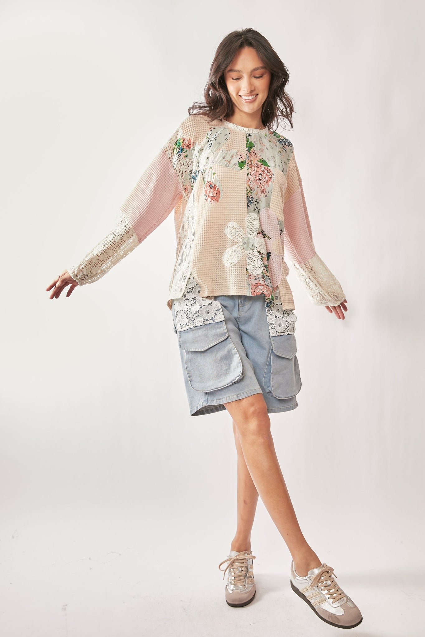 Davi & Dani Contrasting Fabric and Lace Top in Beige