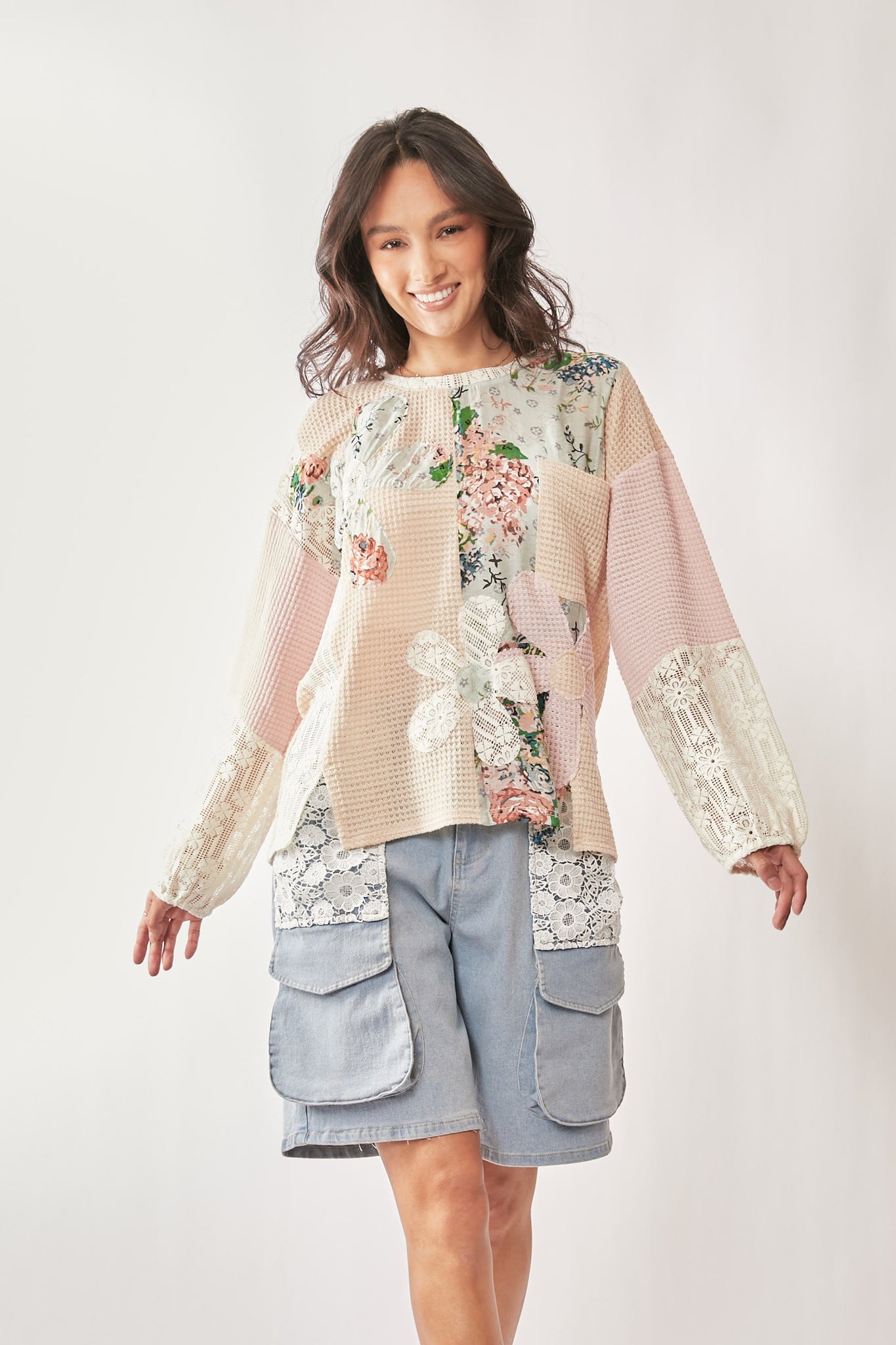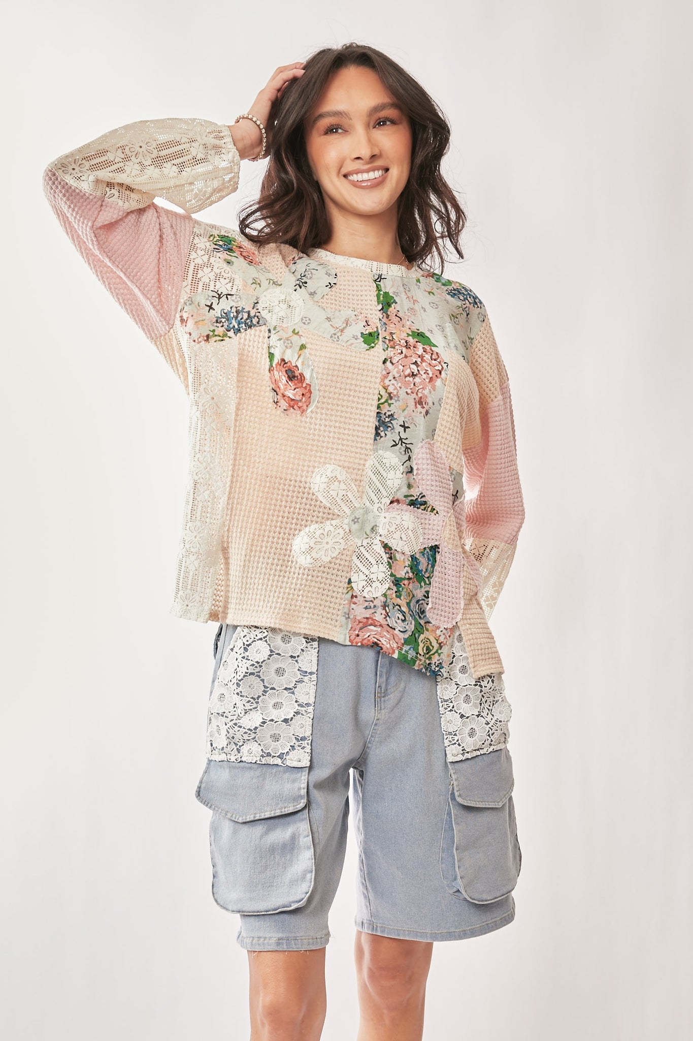• Mixed Fabrics of Floral, Textured Knit, and Lace