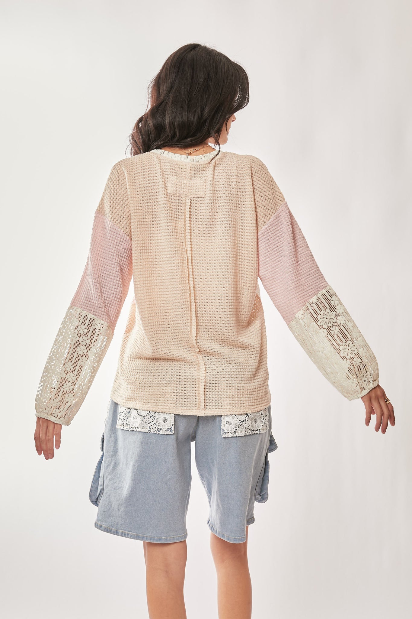 • Load image into Gallery viewer, Davi & Dani Contrasting Fabric and Lace Top in Beige