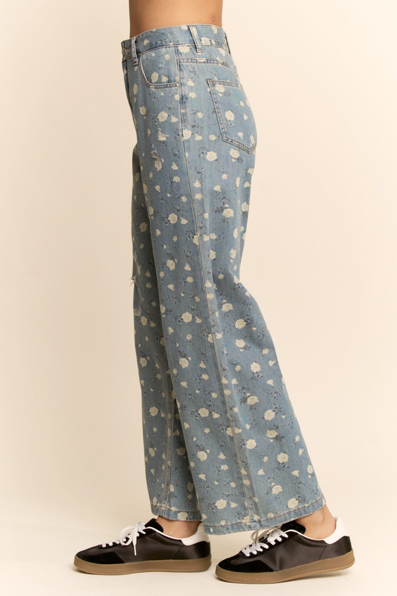 Davi & Dani High Waisted Floral Print Pants in Blue Denim