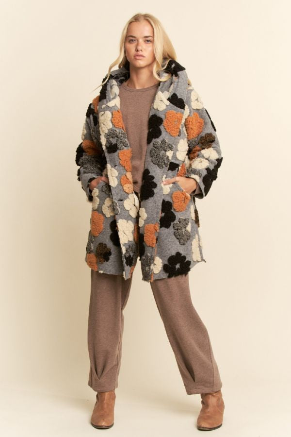 Davi & Dani Multi Flower Embroidery Hooded Jacket in Grey