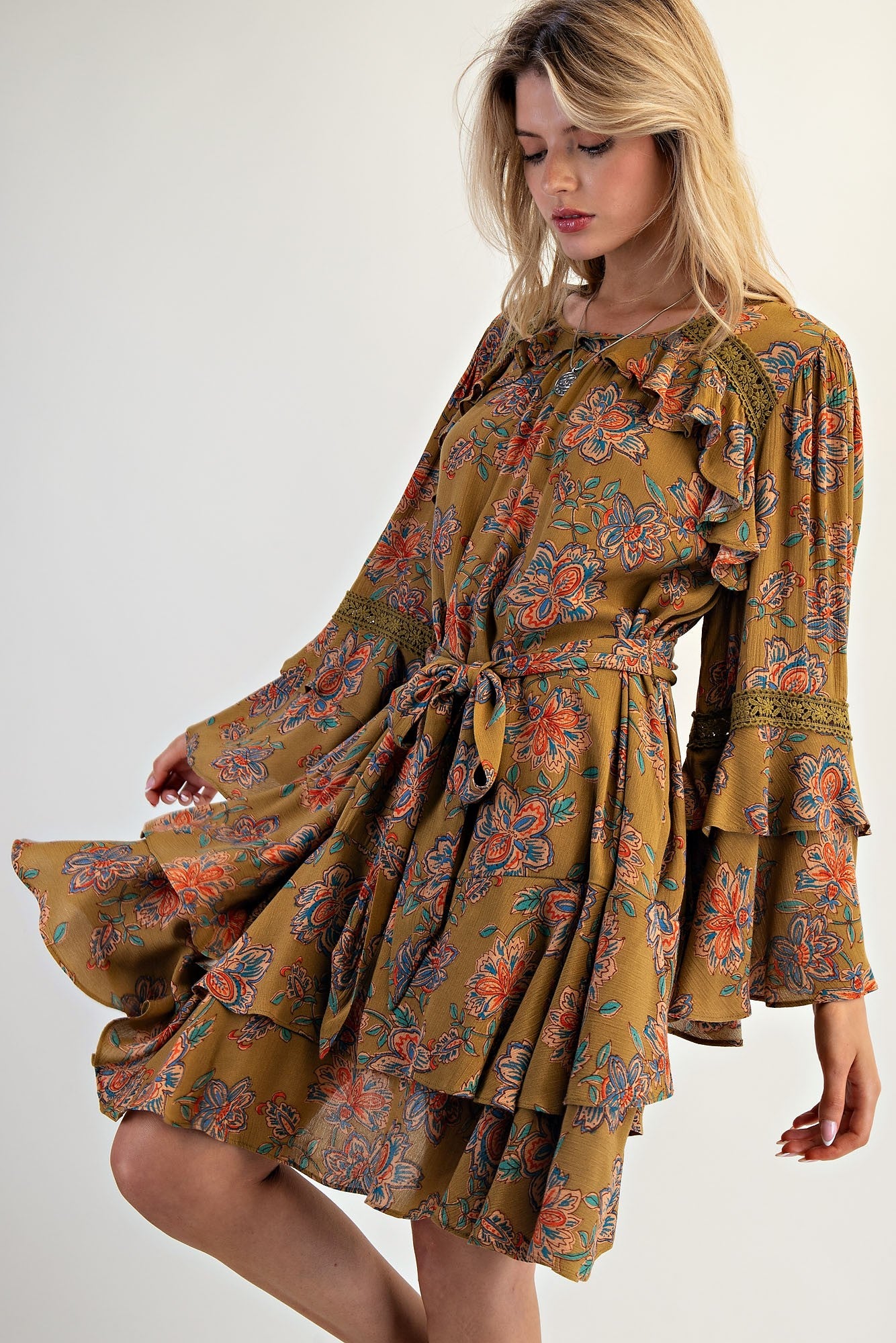 - Ruffle and Crochet Details around Neck