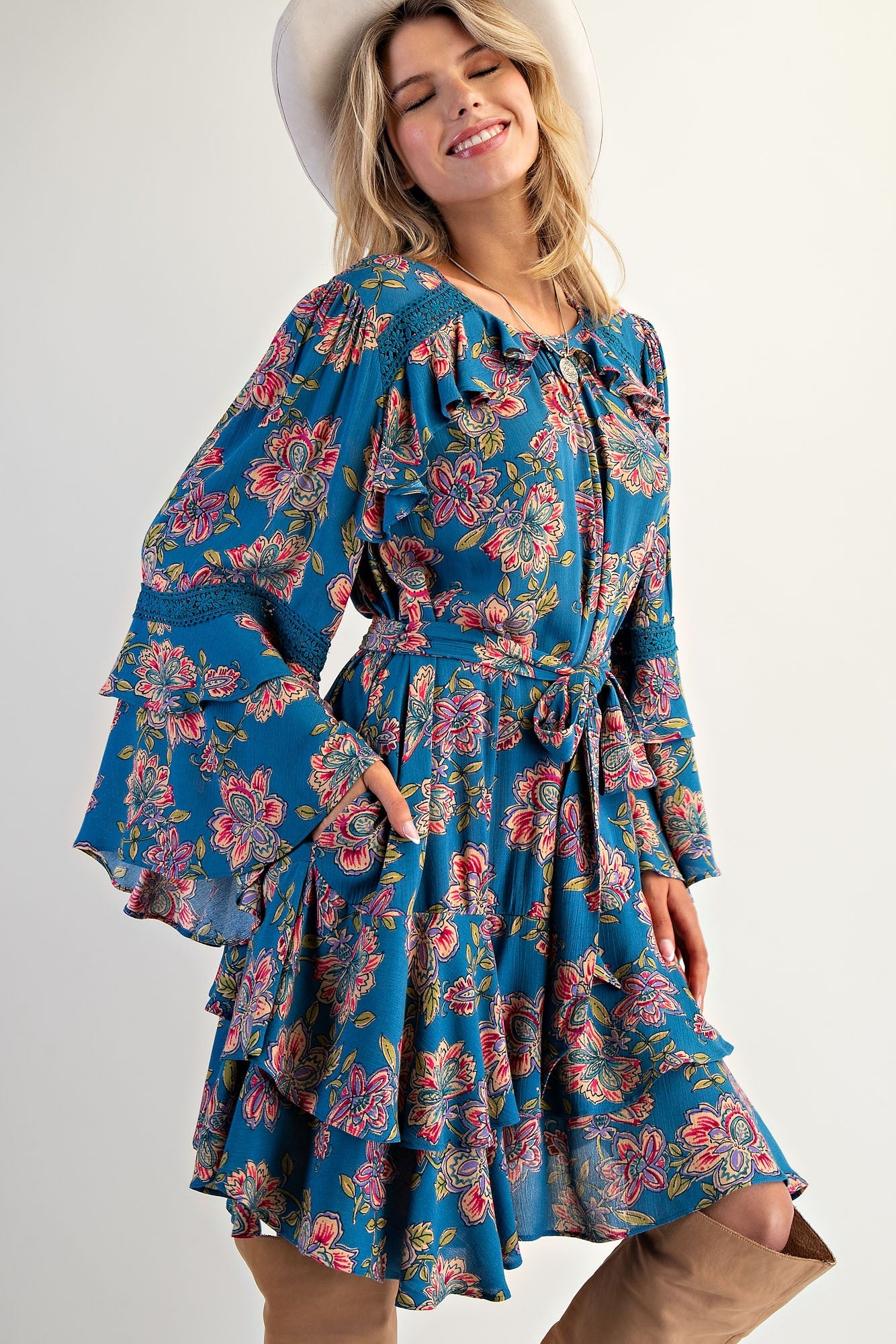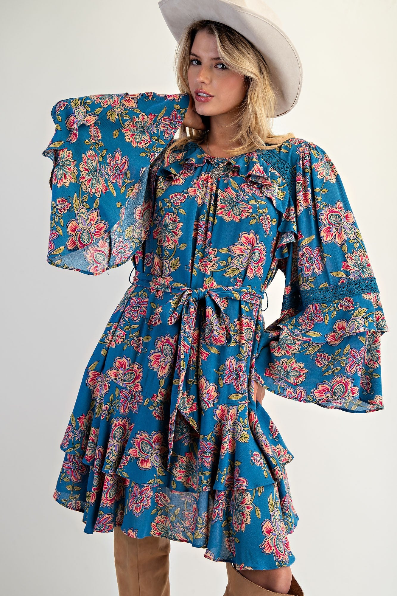 Easel Exclusive Floral Print Mini Dress in Teal