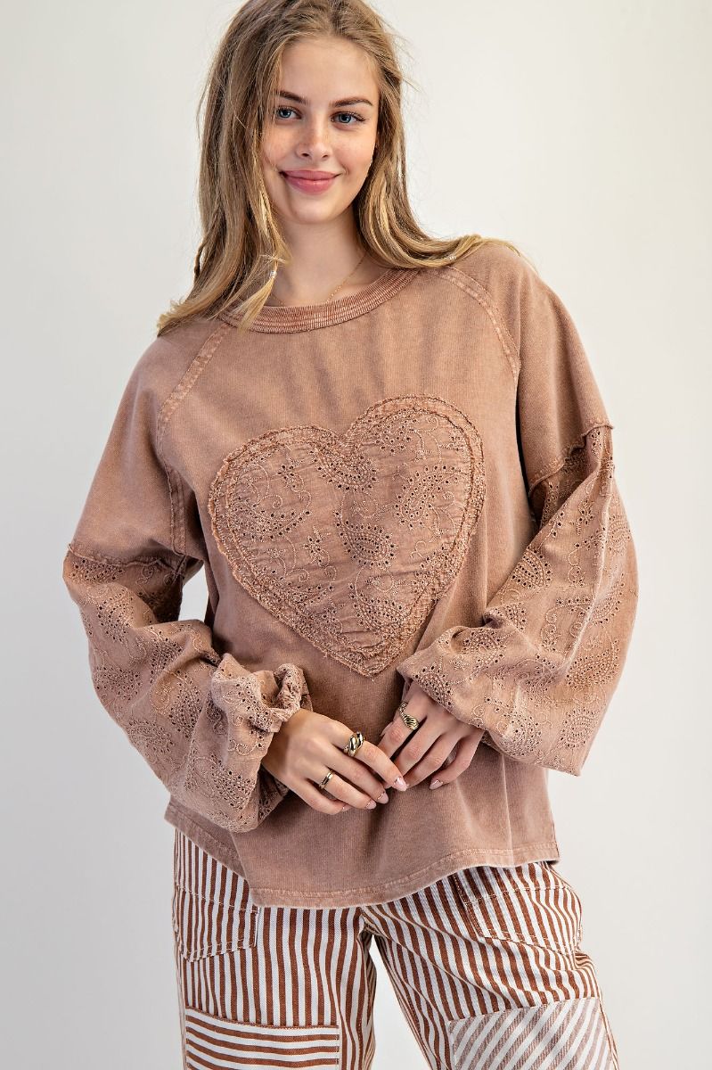 • Load image into Gallery viewer, Easel Eyelet Lace Heart Patched Top in Almond
