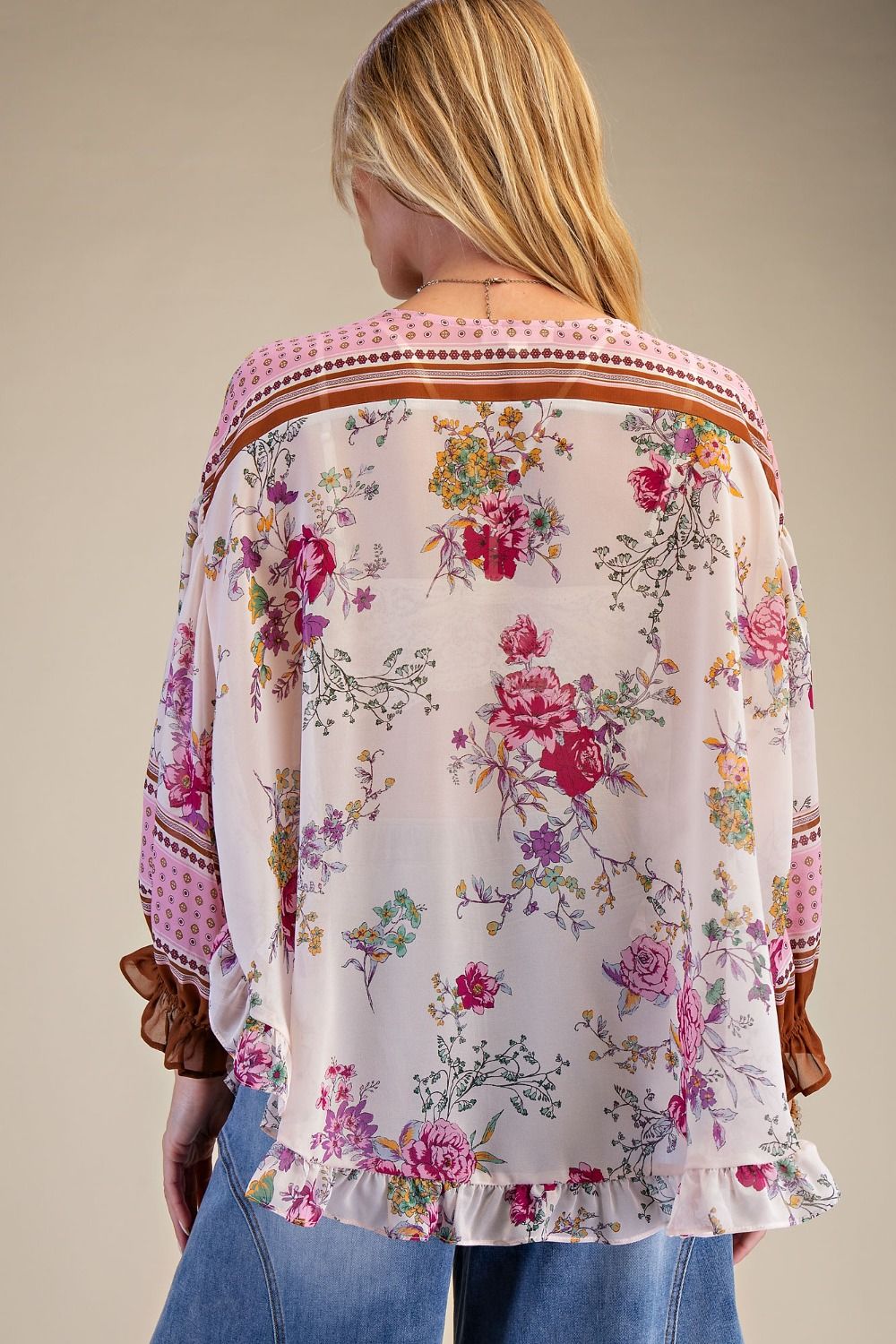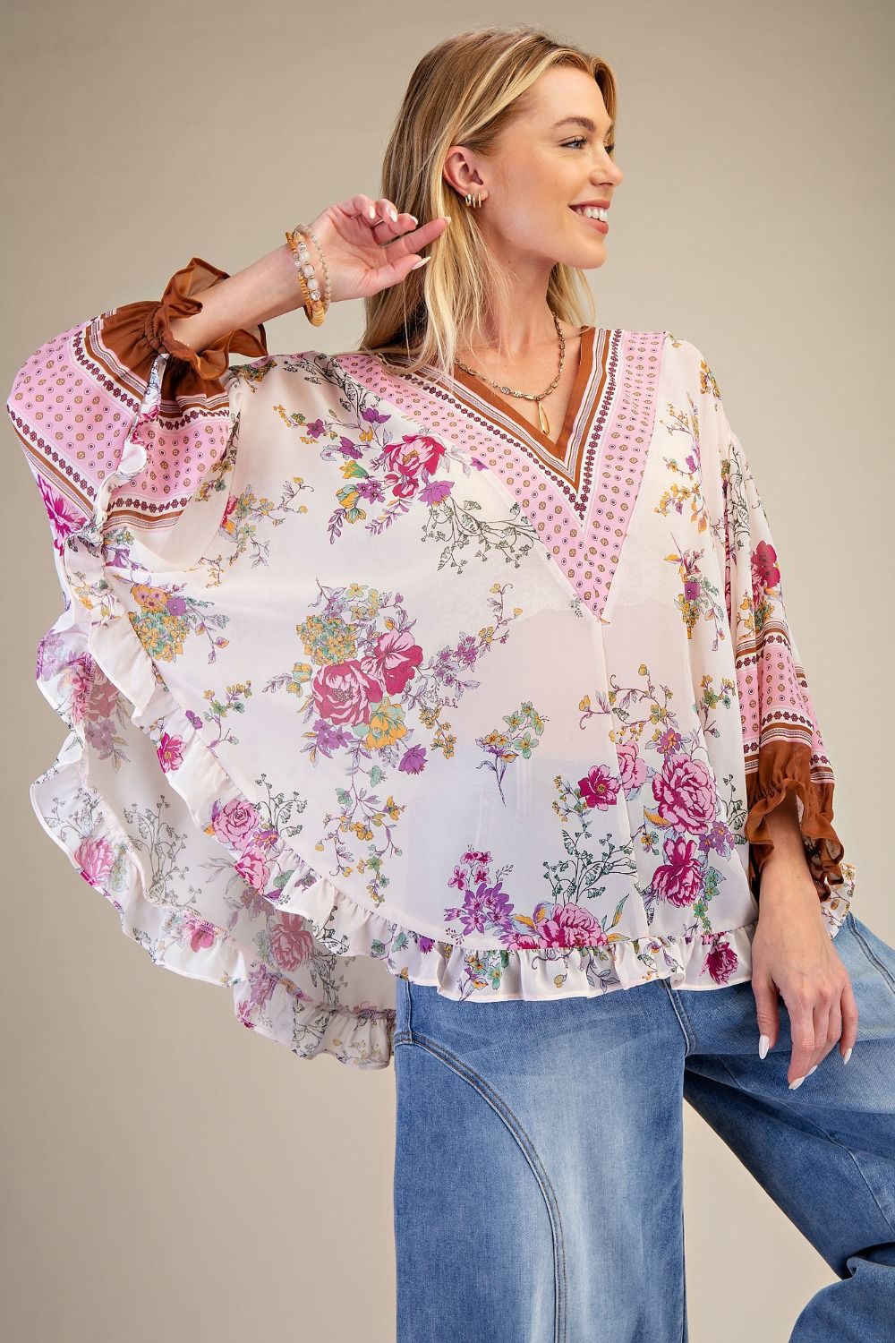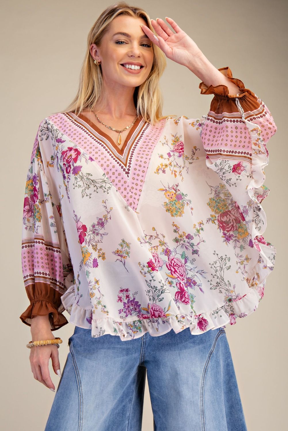 This floral chiffon top features a relaxed, flowy silhouette with dolman sleeves and a soft V neckline. The lightweight fabric drapes beautifully, while the ruffled hemline adds subtle detail and movement. An easy piece that pairs perfectly with jeans or dressier bottoms.