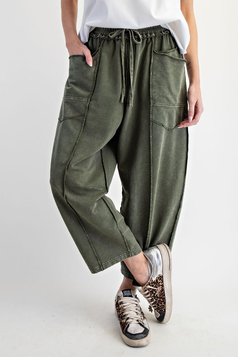 Easel Mineral Washed Terry Knit Barrel Pants in Pine Green