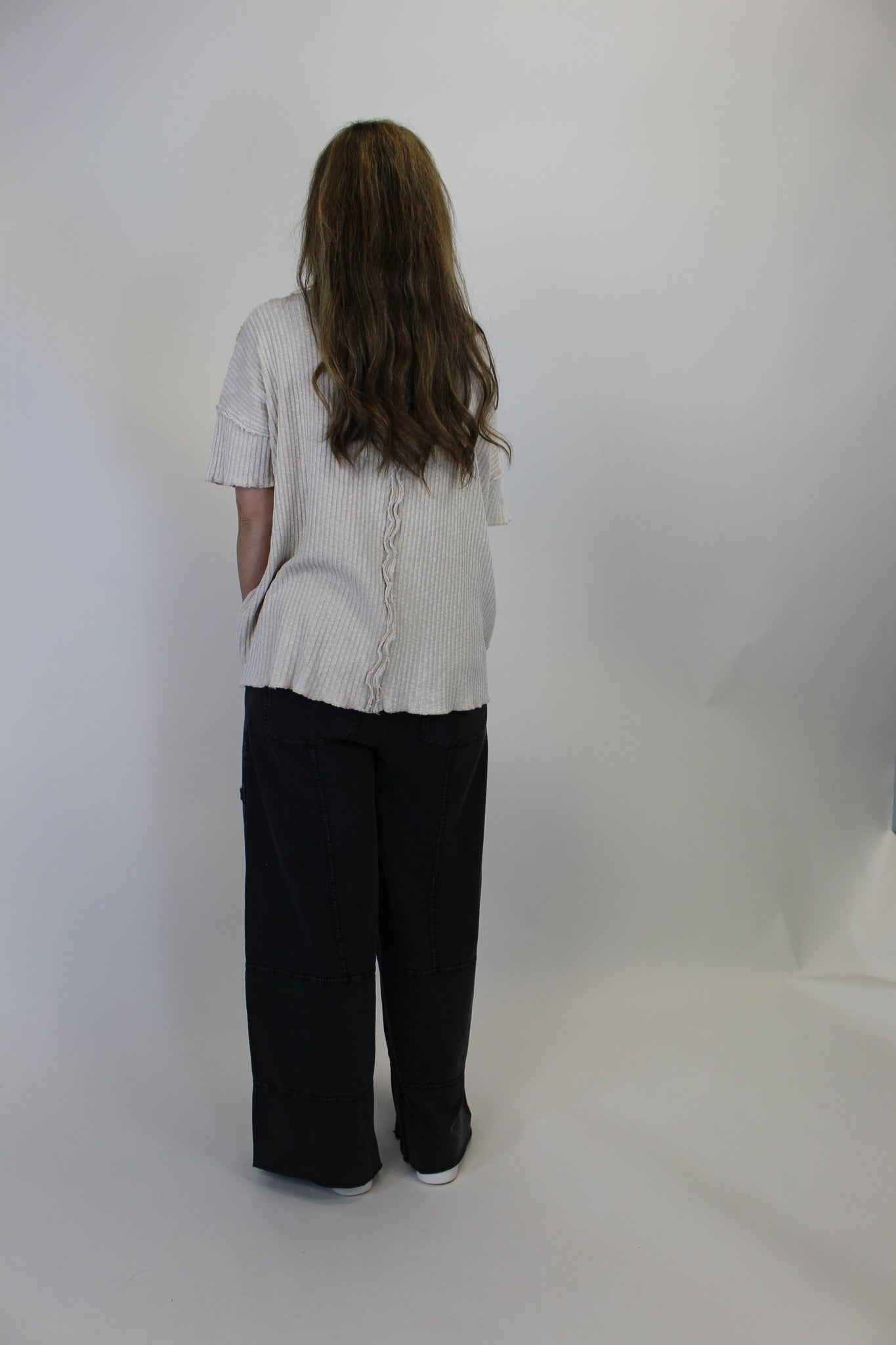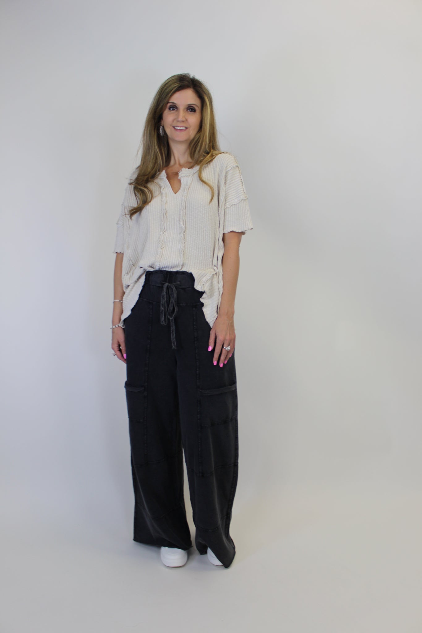These Easel Mineral Washed Terry Knit Pants make a stylish, comfortable wardrobe addition. They feature a thick waistband with scrunch detailing and side, front and back pockets. Crafted with a mineral washed finish, these wide-legged, loose-fitting pants offer a unique seam detailing for added visual appeal. Perfect for a day out or a casual night.