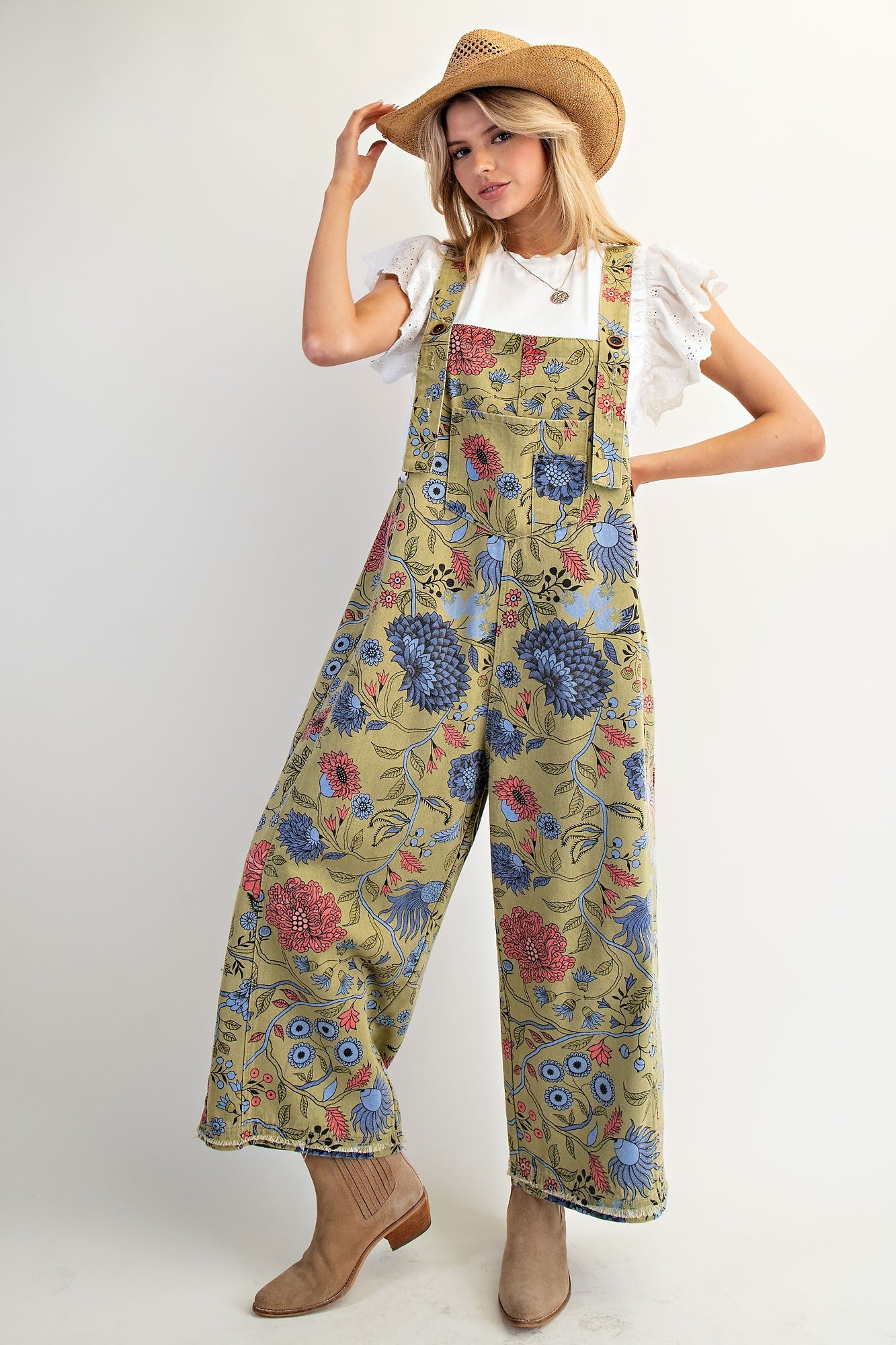 Easel Oversized Floral Print Denim Overall Jumpsuit in Sage