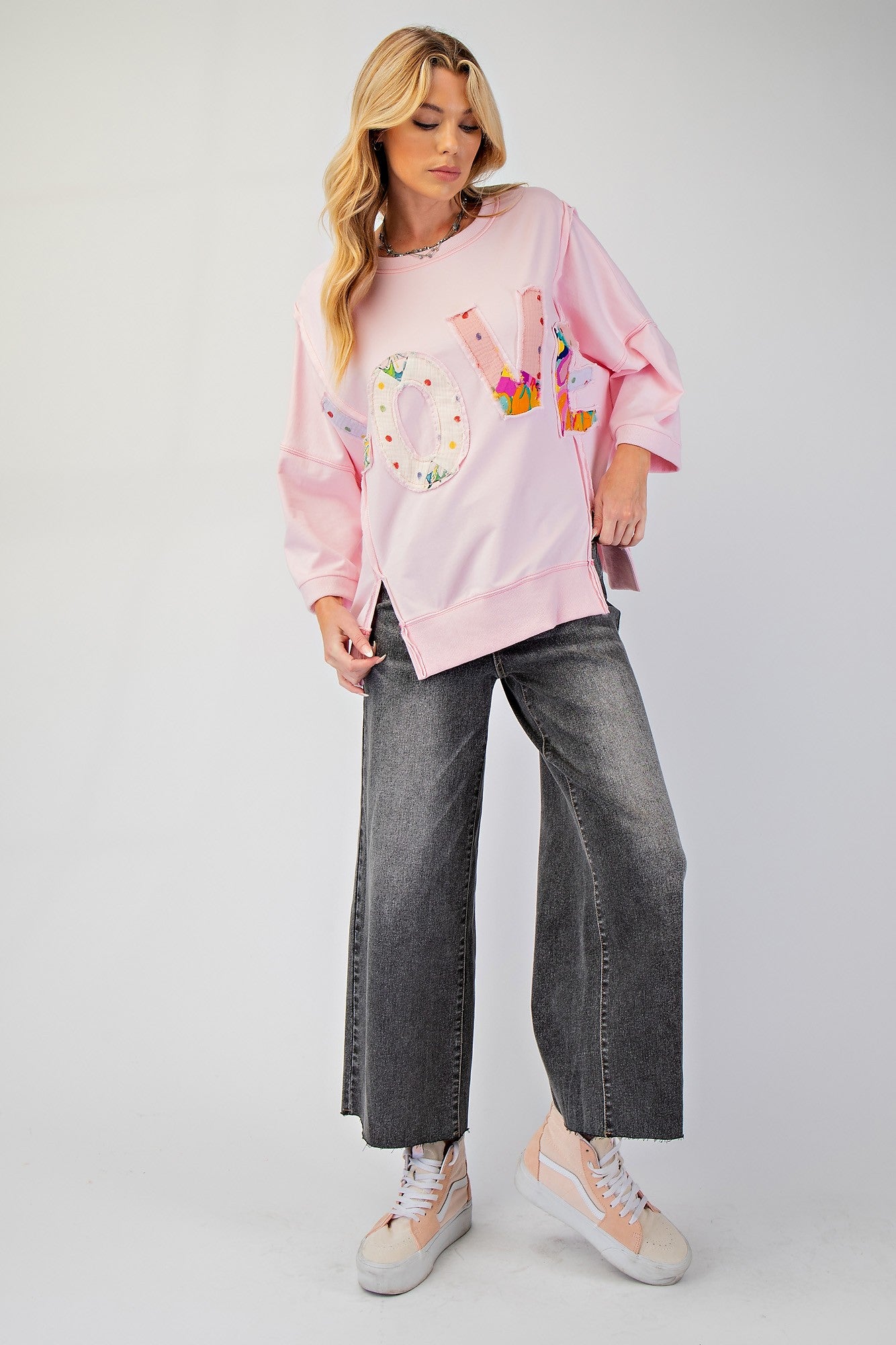 Easel OVERSIZED Top with Mixed Print LOVE Letter Patch Front in Cotton Pink