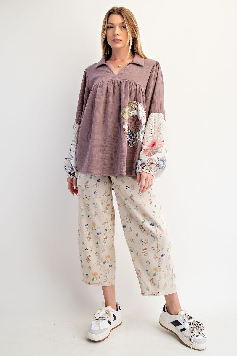 Easel Patched Detail Cotton Gauze Top in Mocha