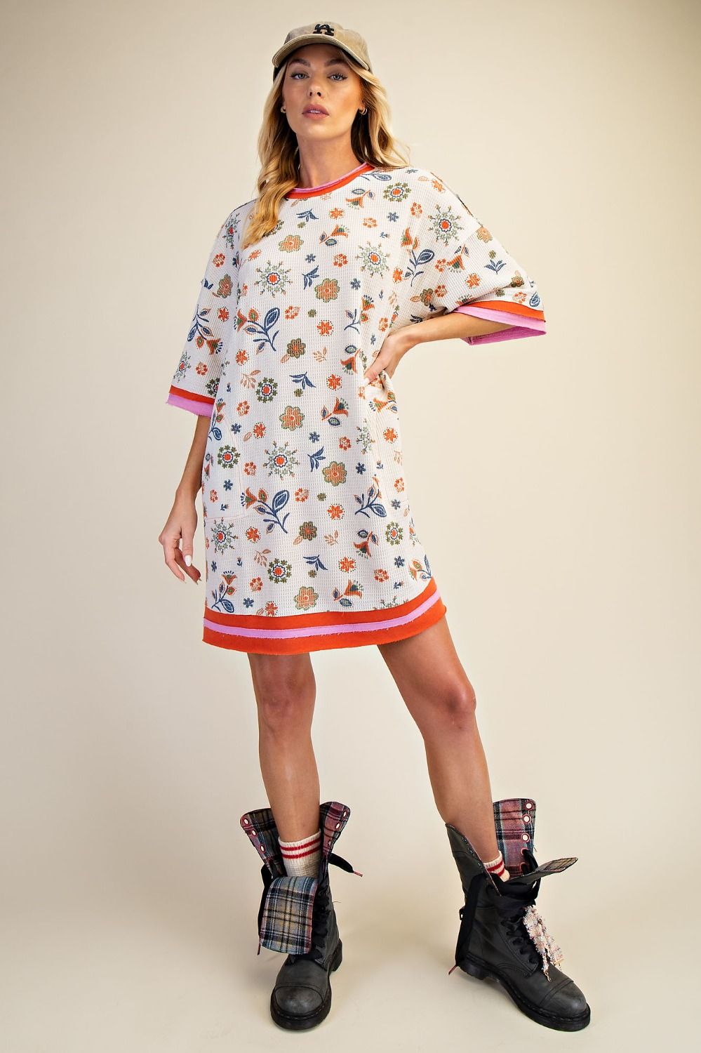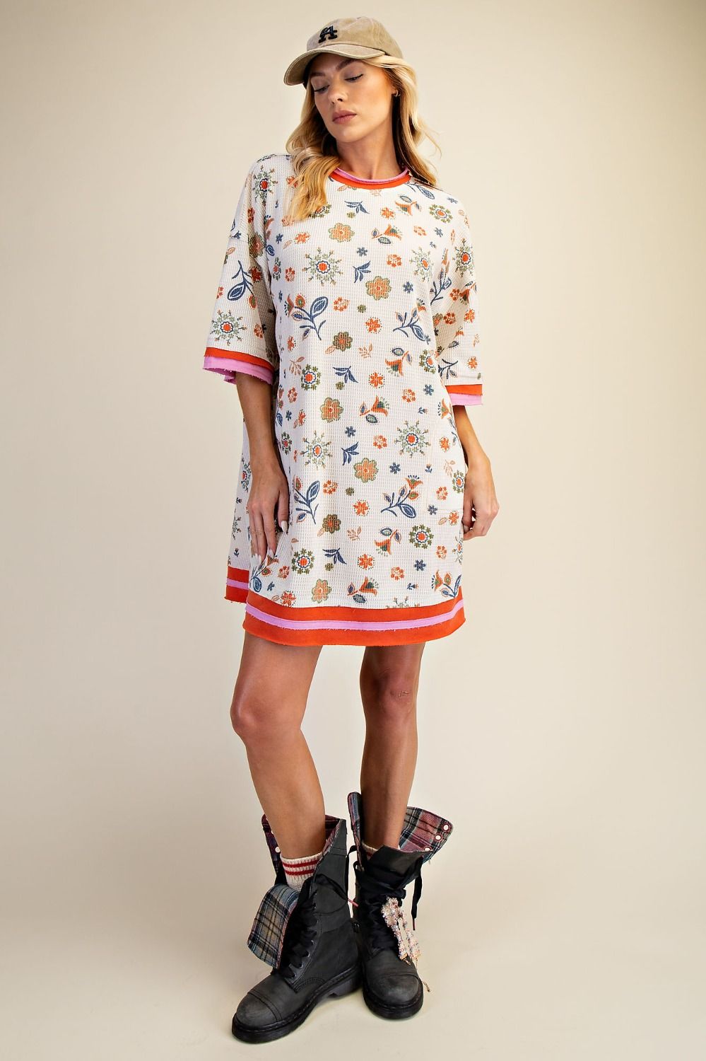 Easel Signature Floral Print Waffle Knit Dress in Sage Rust