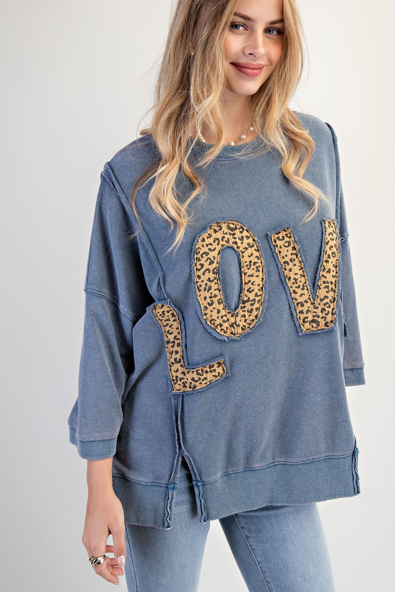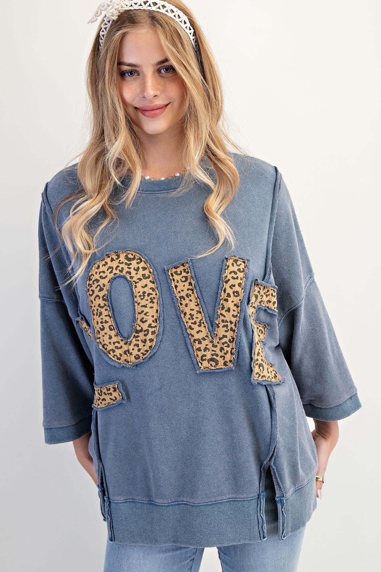 Easel Solid Color Terry Knit Top with Leopard Print LOVE Patched Front in Washed Denim